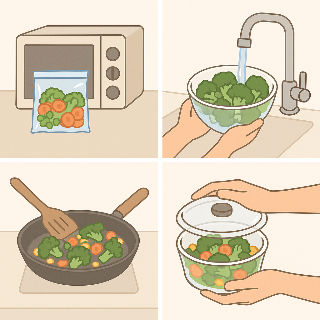 냉동 채소나 만두류는 물에 삶기보다는 찜기나 전자레인지 조리로 비타민 손실을 줄일 수 있습니다. - 짧고 강한 열 처리