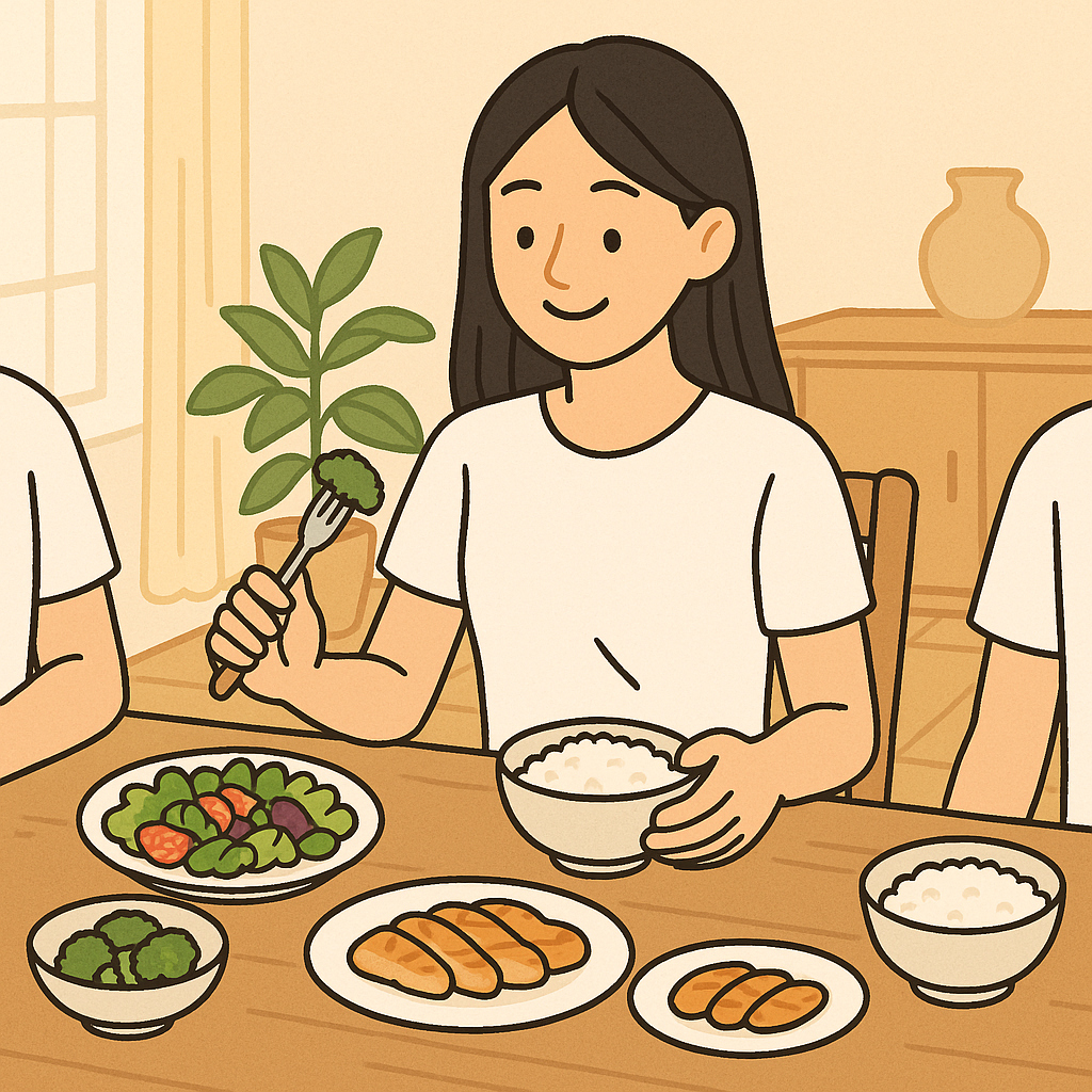 - 아침 식사에도 적용 가능: 삶은 달걀 + 채소 → 통곡물 식빵 순